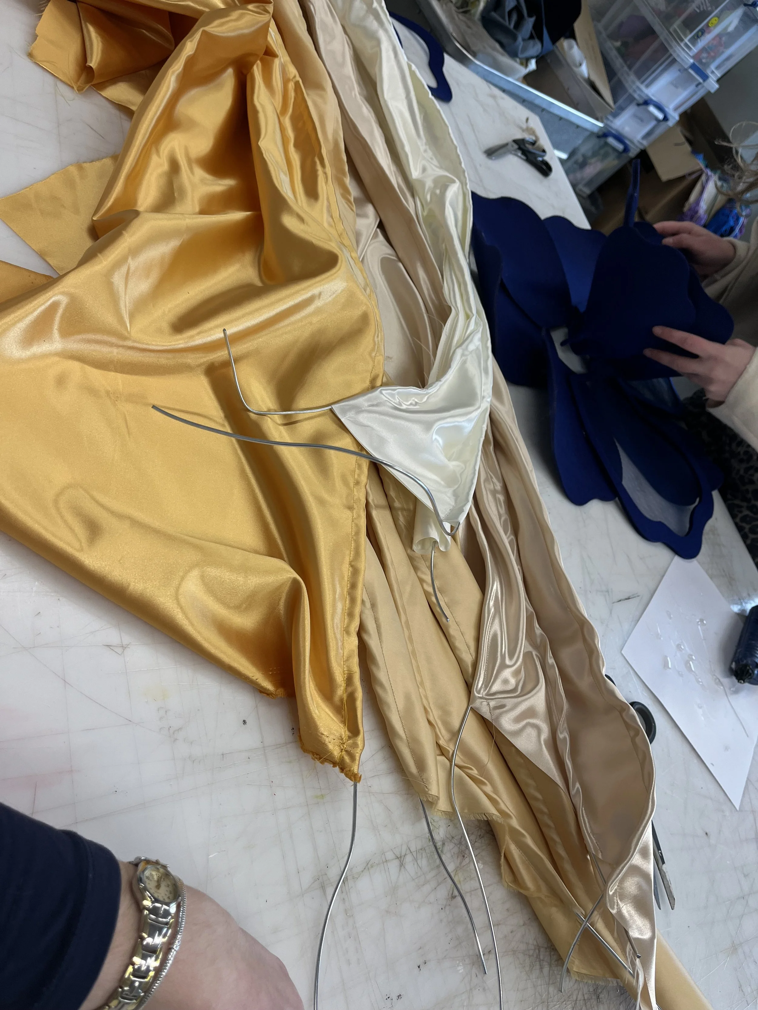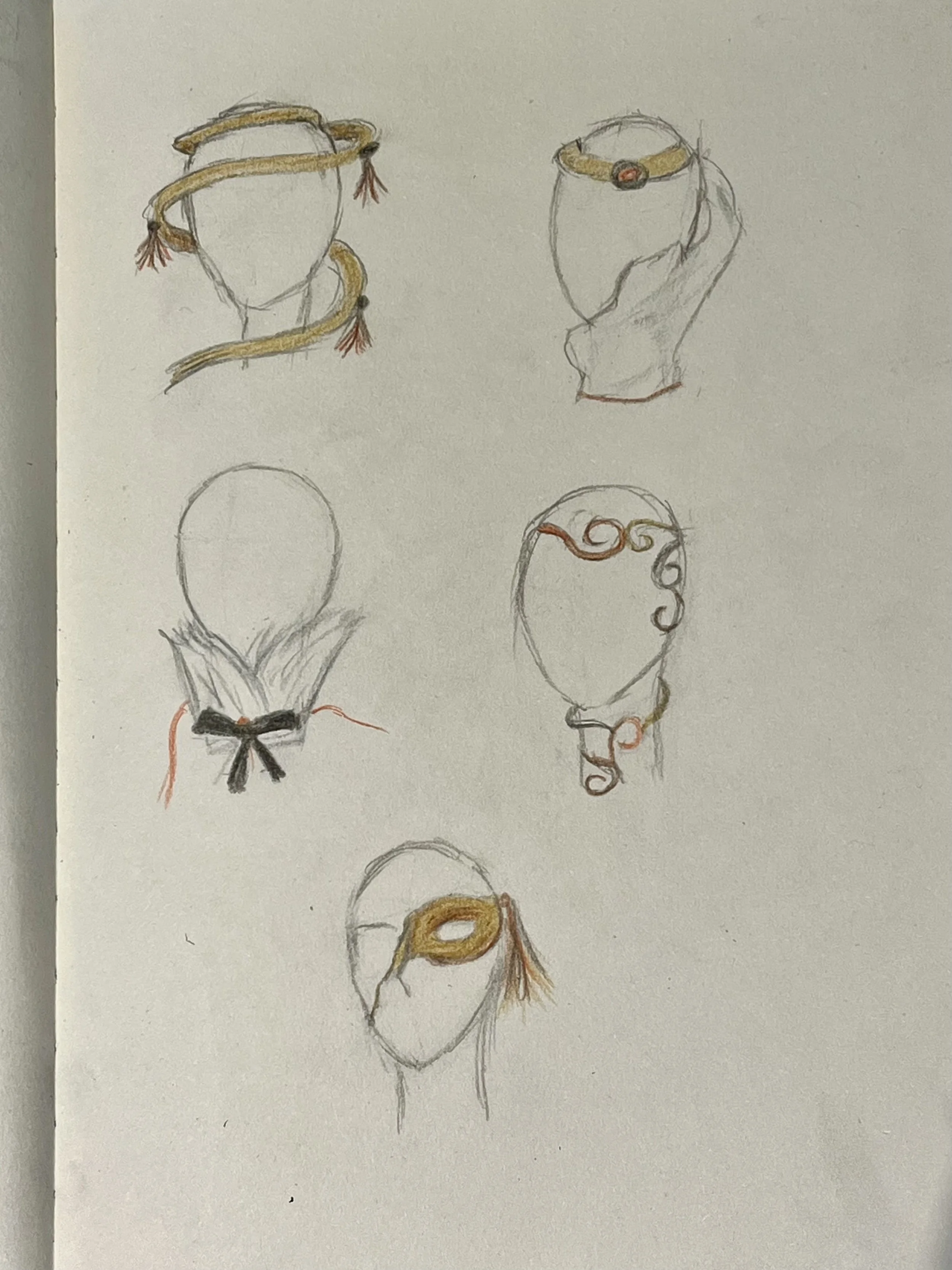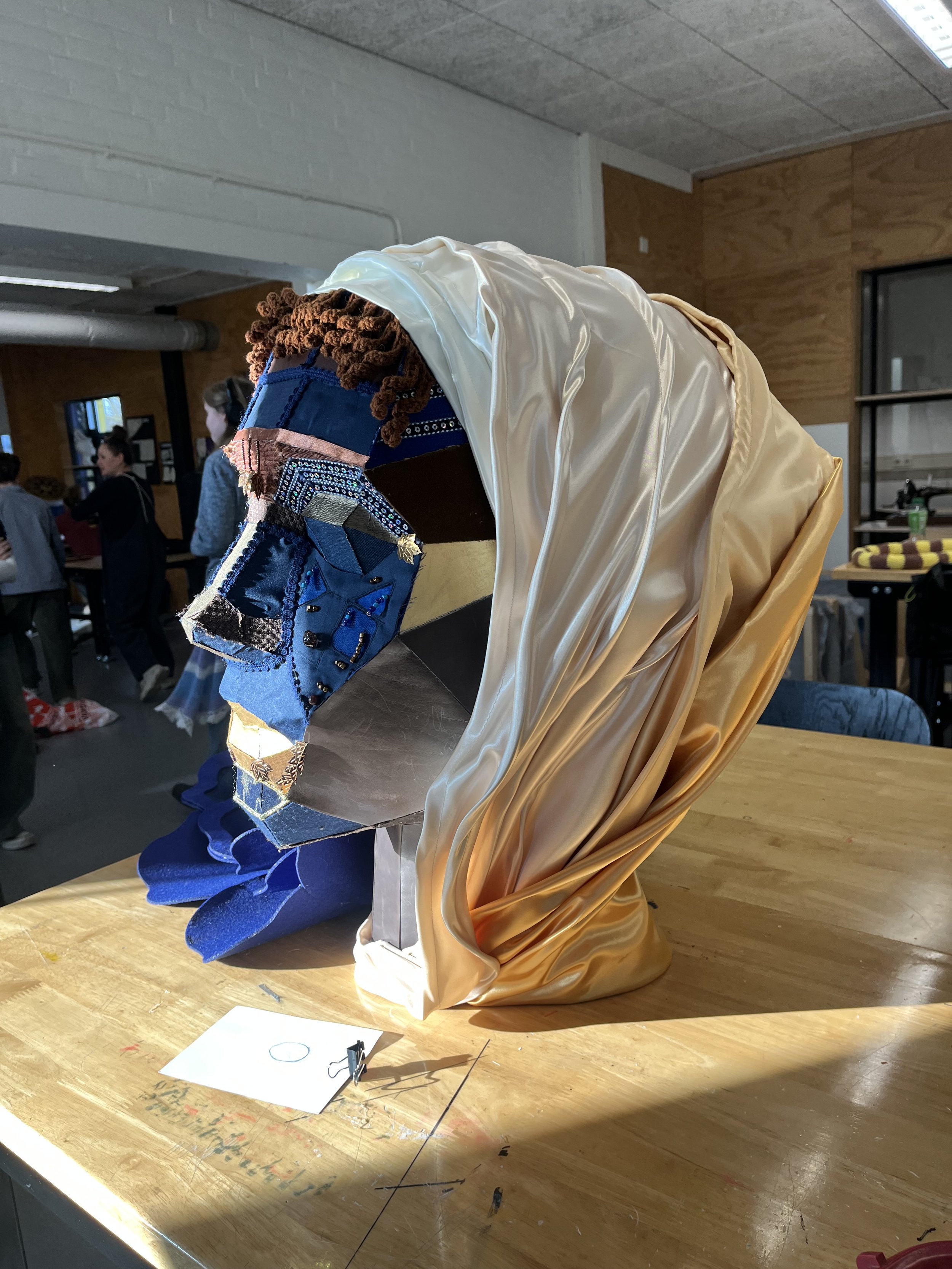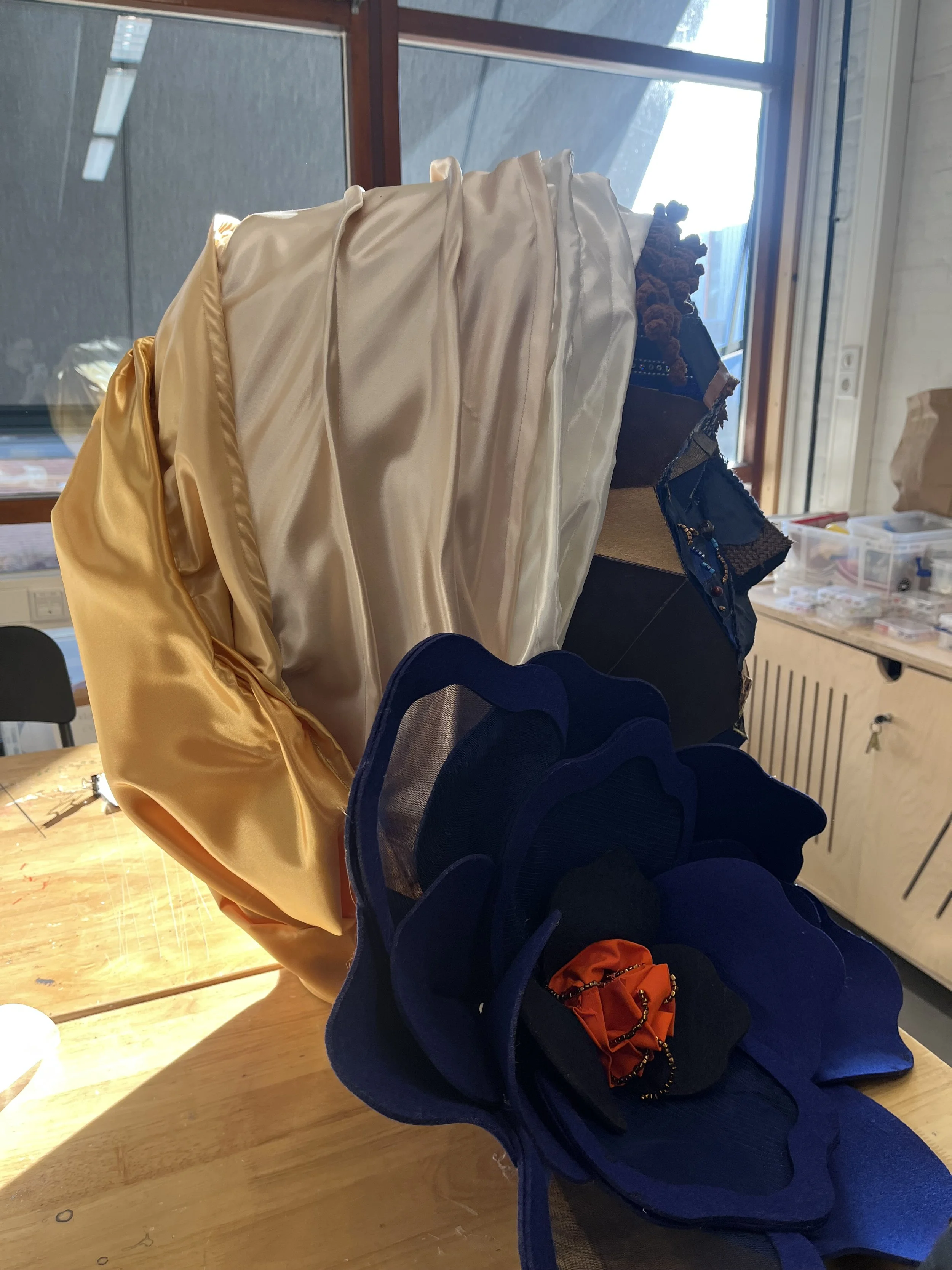 We decided to make a layered hood using satin fabrics of white to gold tones. It was also decorated by a matching flower and, with the face decorations, we managed to give a mysterious but feminine look, while trying to keep a bit of the 17th century aesthetic.