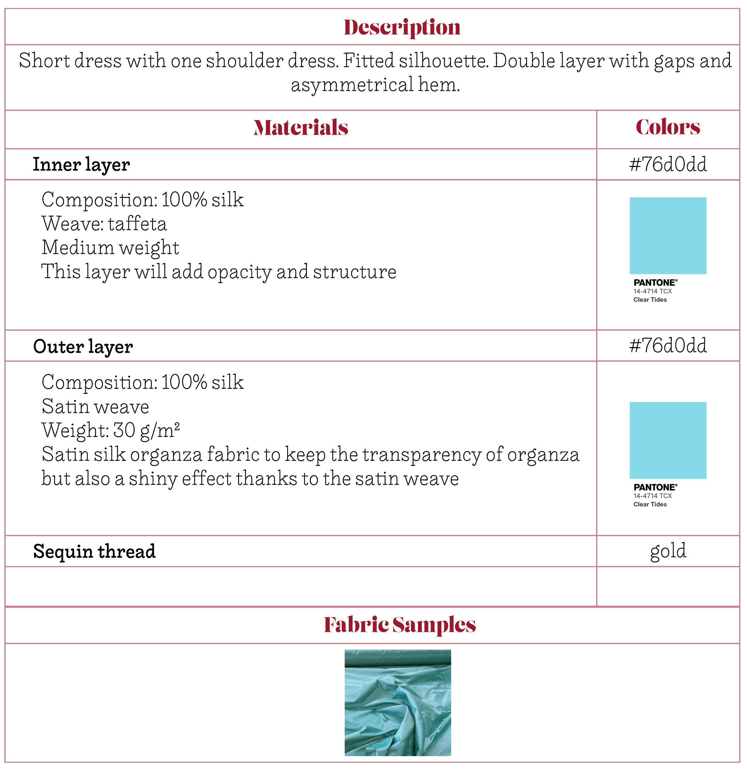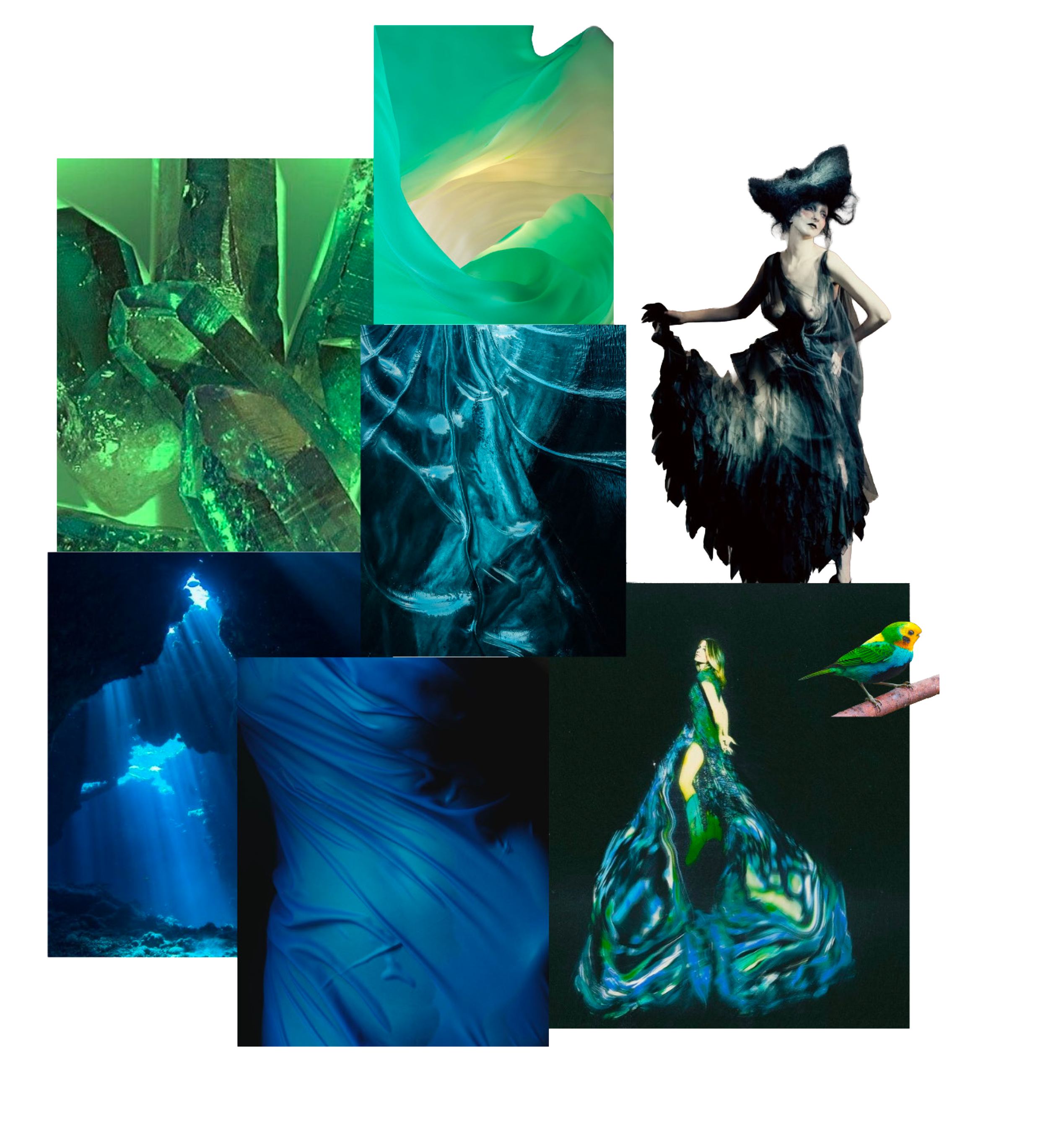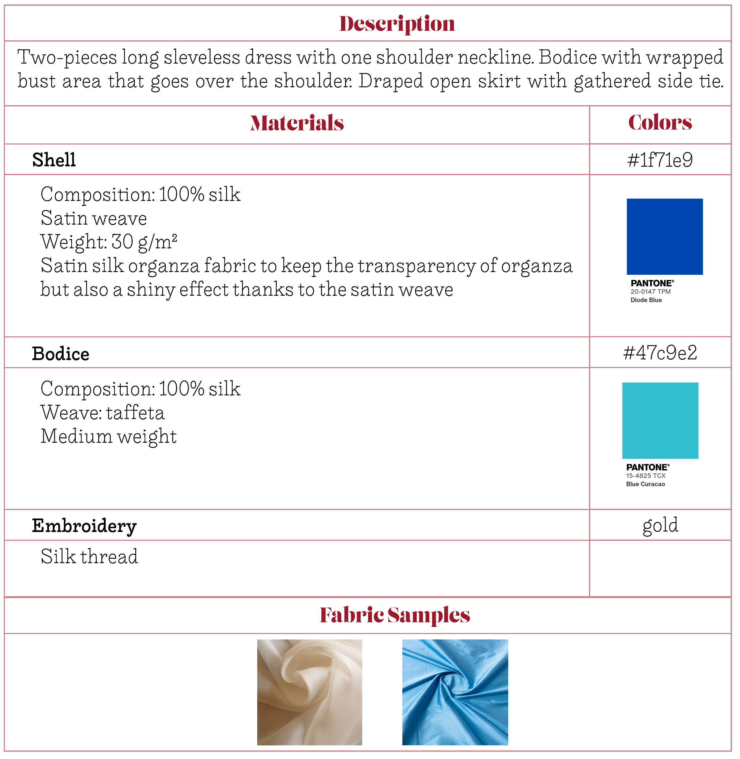 Main inspirations are typical birds and flowers, matching with colours red and blue (representing the national flag). The fabric and style direction focuses mainly on silk fibers and light fabrics like chiffon. These will help achieve a soft look reminiscent of feathers and petals, also using layers and draping to create smooth flower-like designs.